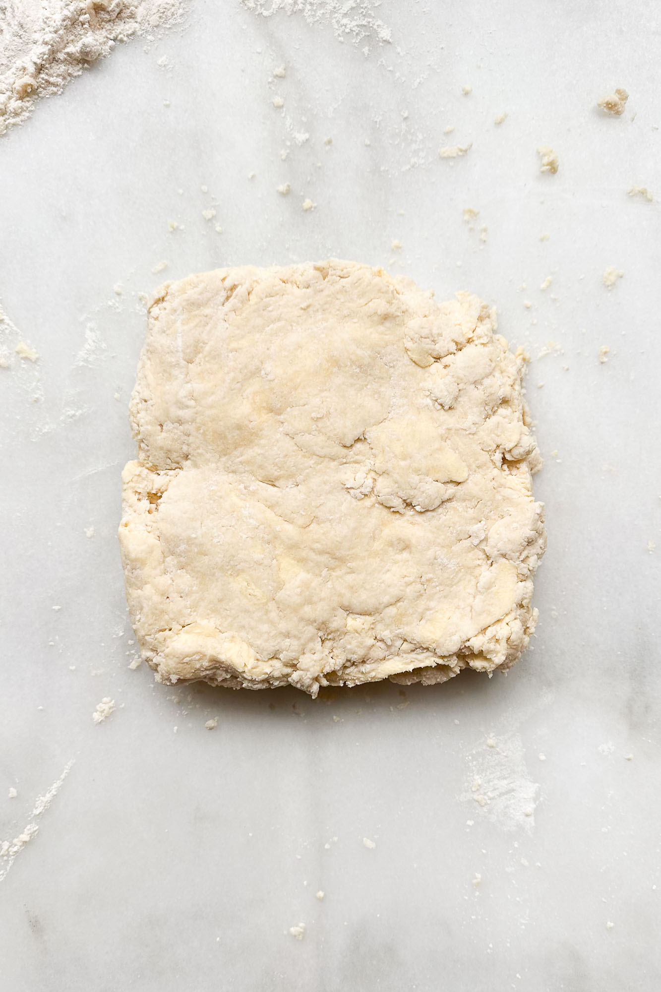 Turn your biscuit dough out onto counter or surface. Work with your hands to form a rectangle. Gather up any flour or bits left behind. Once your rectangle is formed, cut it in half with a bench scraper or knife. Place one half on top of the other. It will look a mess, this is normal. Cut it in quarters if that is easier. Press gently to flatten the halves and press them together.