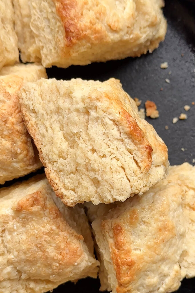 - Bake Biscuits: Place biscuit pieces on a baking sheet or cast iron nestled next to each other. Baste the tops of the biscuits lightly before baking. Bake biscuits 15-20 minutes until biscuits are risen, flaky & golden. Brush with melted butter as they come out of the oven.