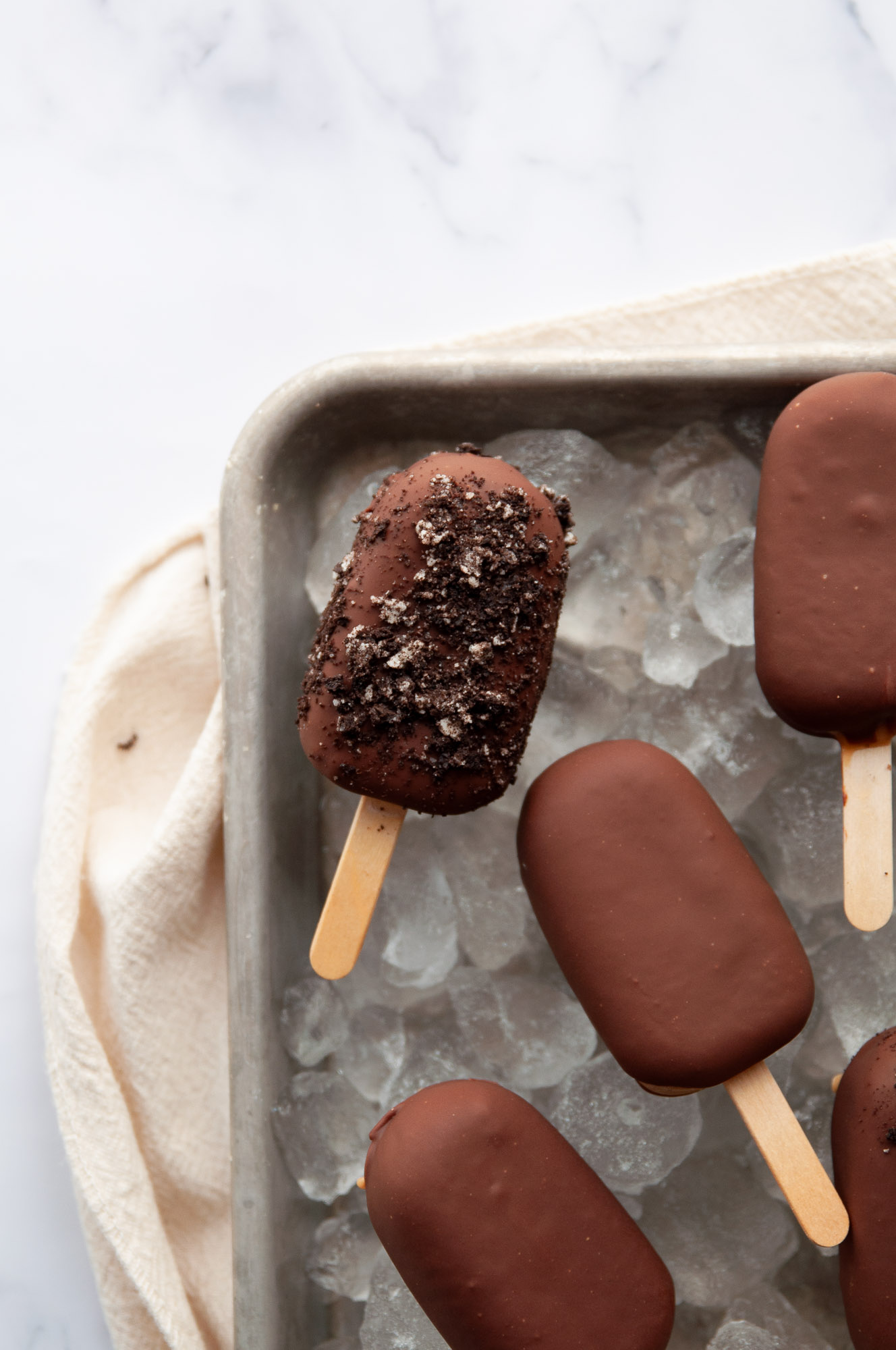 - For chocolate shell: microwave coconut oil & chocolate chips In a small mug In 30 second Increments until melted. For Peanut Butter Shell: microwave coconut oil & peanut butter In a small mug In 30 second Increments until melted. Remove frozen popsicle from mold. Make room in freezer for a baking sheet. Line baking sheet with parchment. Dunk frozen pop Into chocolate or peanut butter & shake off excess. Freeze 30 minutes- 1hr. Dunk frozen peanut butter shell in chocolate If doing both. Freeze on baking sheet 30 mins to an hr. Serve. If you want, add some crushed Oreos while chocolate shell Is still warm!