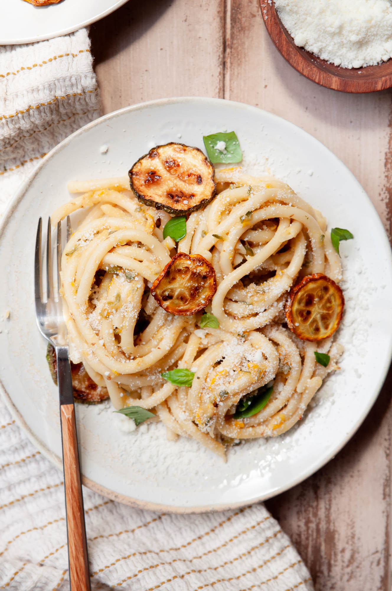 - Finish sauce: Do not drain noodles before reserving 1 & ½ to 2 cups of pasta water. Add cheese and some lemon zest to jammy zucchini. Pour 1 cup pasta water into zucchini & toss until everything is combined and any browning is lifted off the pan. The sauce should be thick and silky, not too watery. Sometimes you need 2 cups of the pasta water, sometimes only about 1 &½. Add more pasta water, cheese, salt and lemon zest to taste or juice.